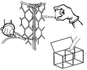 2、把每個側面立起來,組合成一個網箱狀。網箱的每一個表面都有較粗的邊絲,在網面的邊角把這些重合的粗邊絲互相擰在一起。這些擰在一起的邊絲在邊角和綁絲重合。