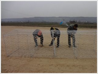 4.前板、后板和尾板大致向垂直方向開口,呈開口箱形。 側(cè)翼應(yīng)適當折疊并相互重疊。 所有隔板和尾板應(yīng)固定并固定在前后板上。 組裝時,鍍鋅石籠網(wǎng)應(yīng)與周圍表面、尾部和空間一起安裝,并應(yīng)確保所有折痕處于正確的方向,每個側(cè)面的頂部水平。 后,鍍鋅石籠網(wǎng)的邊緣通過絞合鋼絲連接。